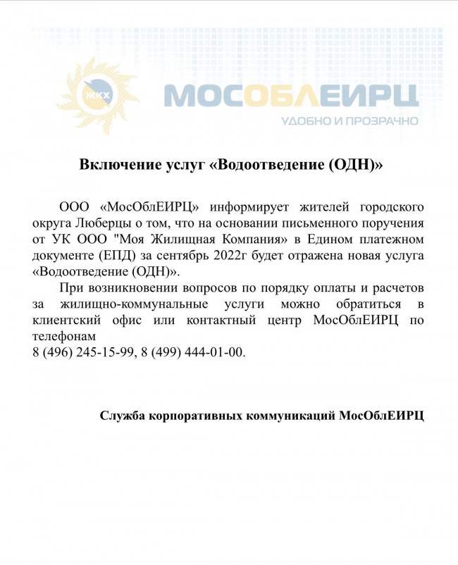 ВКЛЮЧЕНИЕ УСЛУГ ВОДООТВЕДЕНИЕ (ОДН)